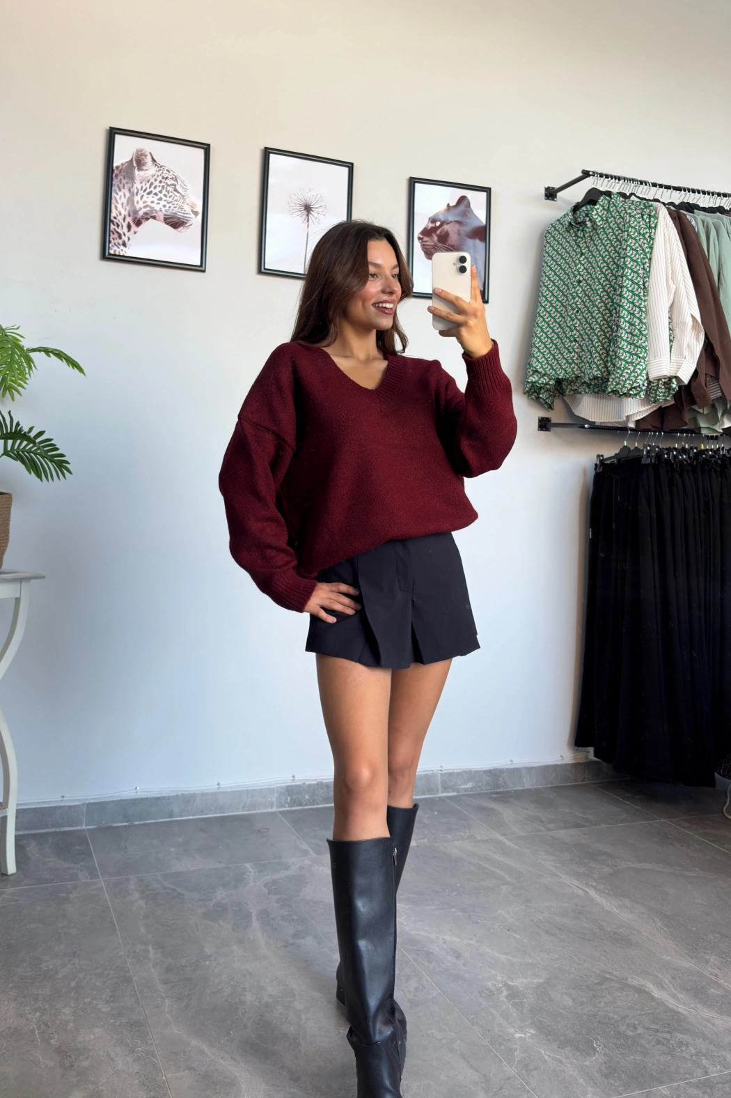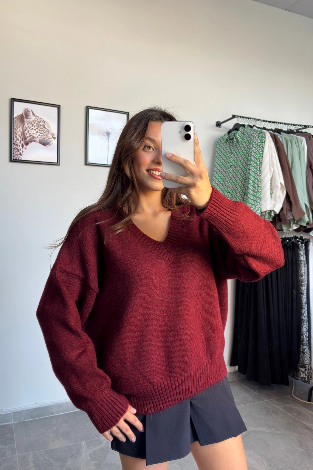 Bordo Taş Düğme Oversize Hırka