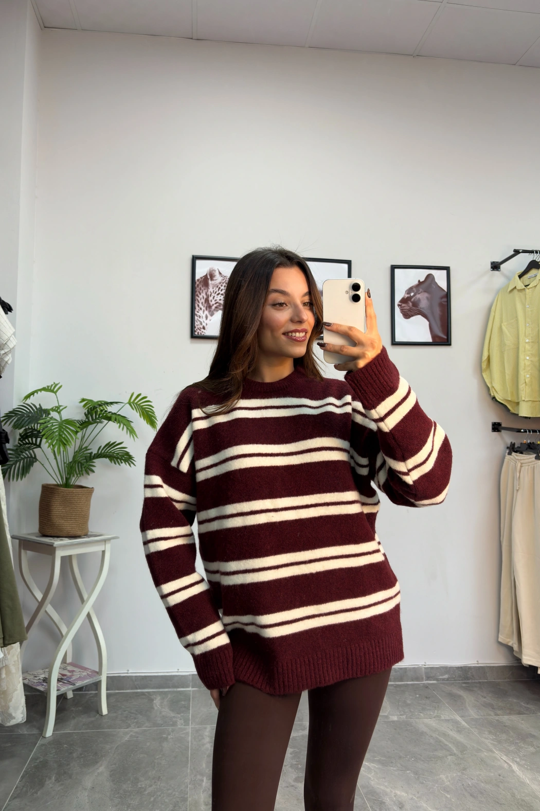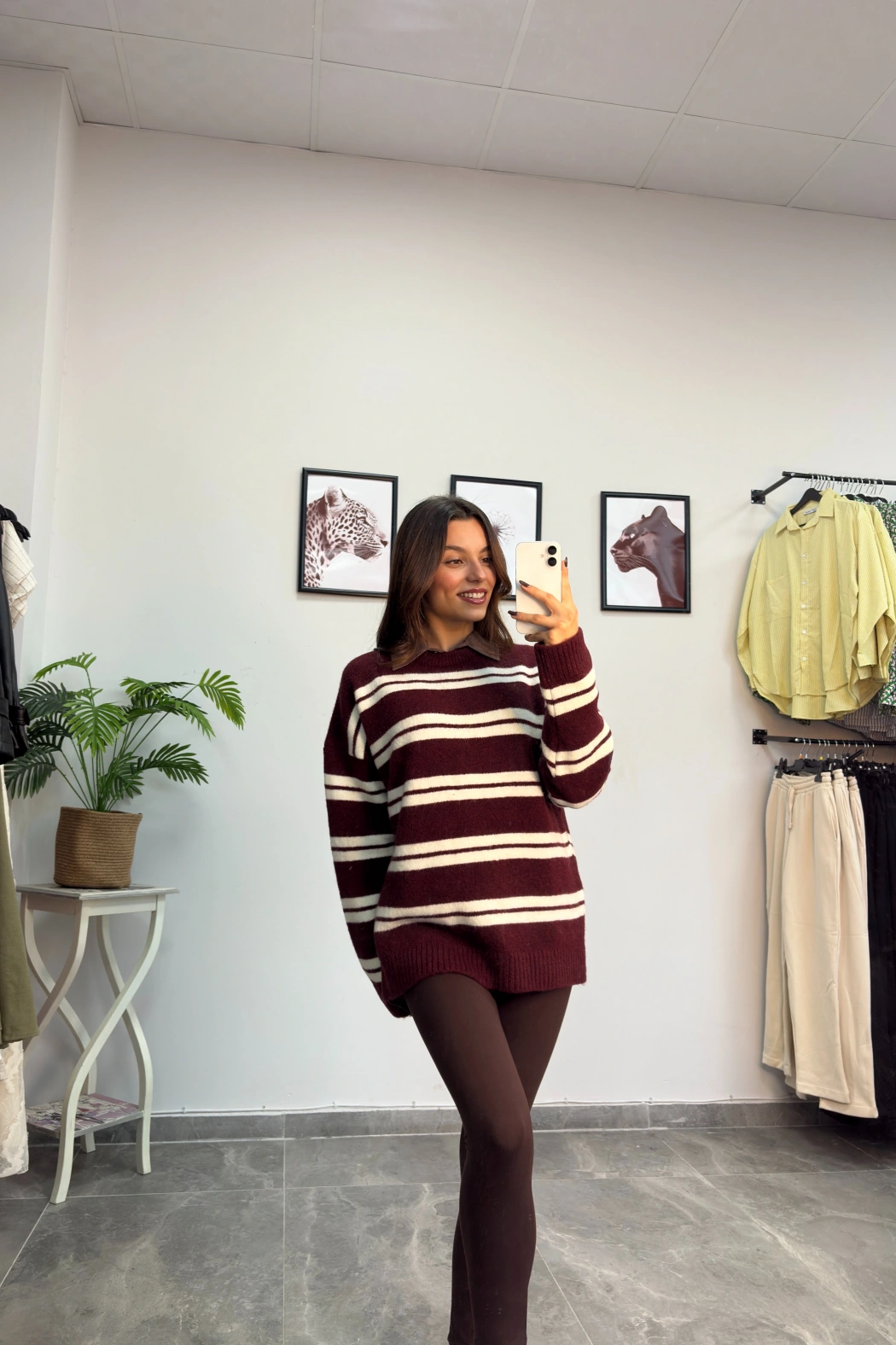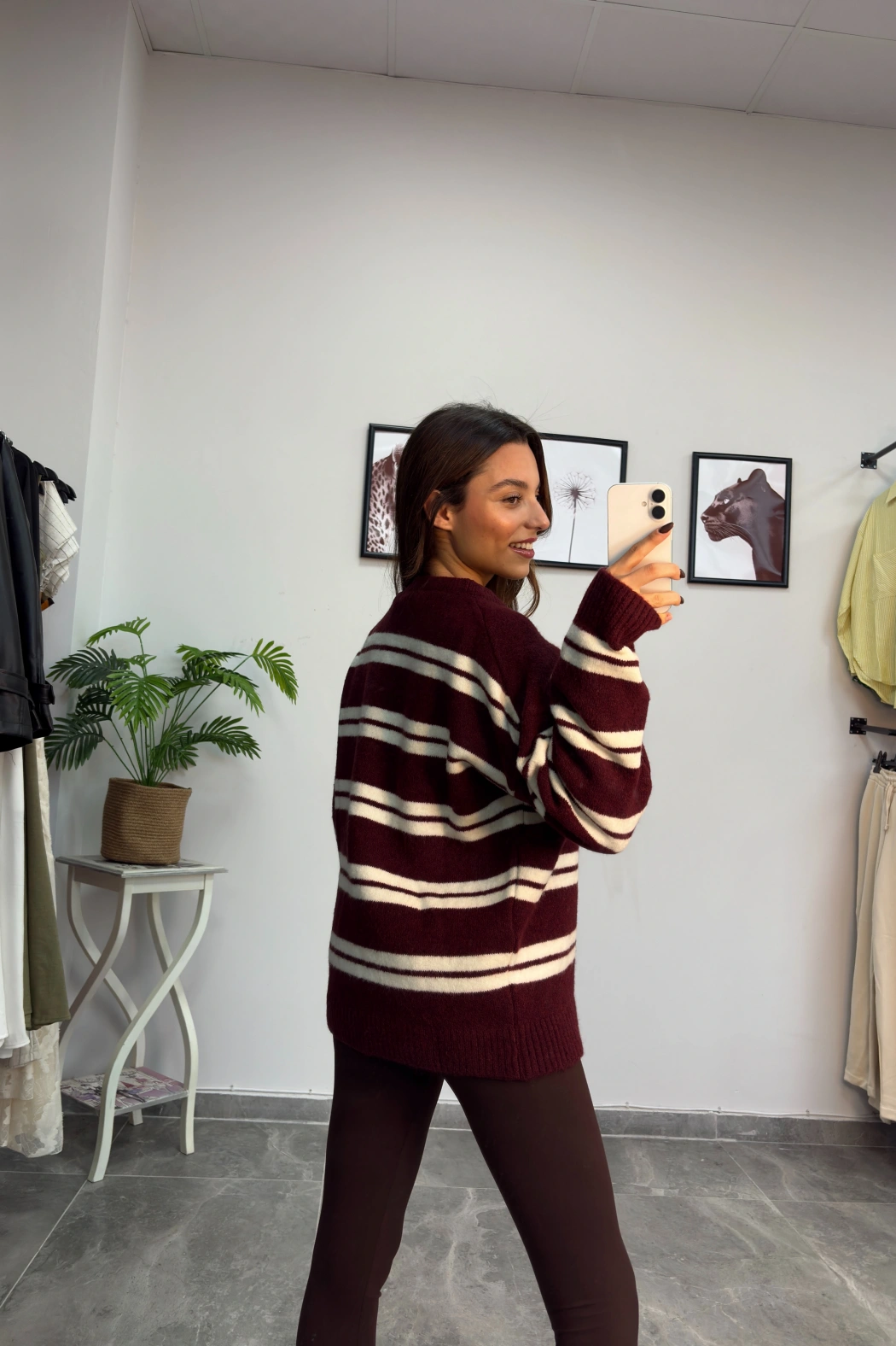 Polo Yaka Bordo Lacivert Çizgili Kazak
