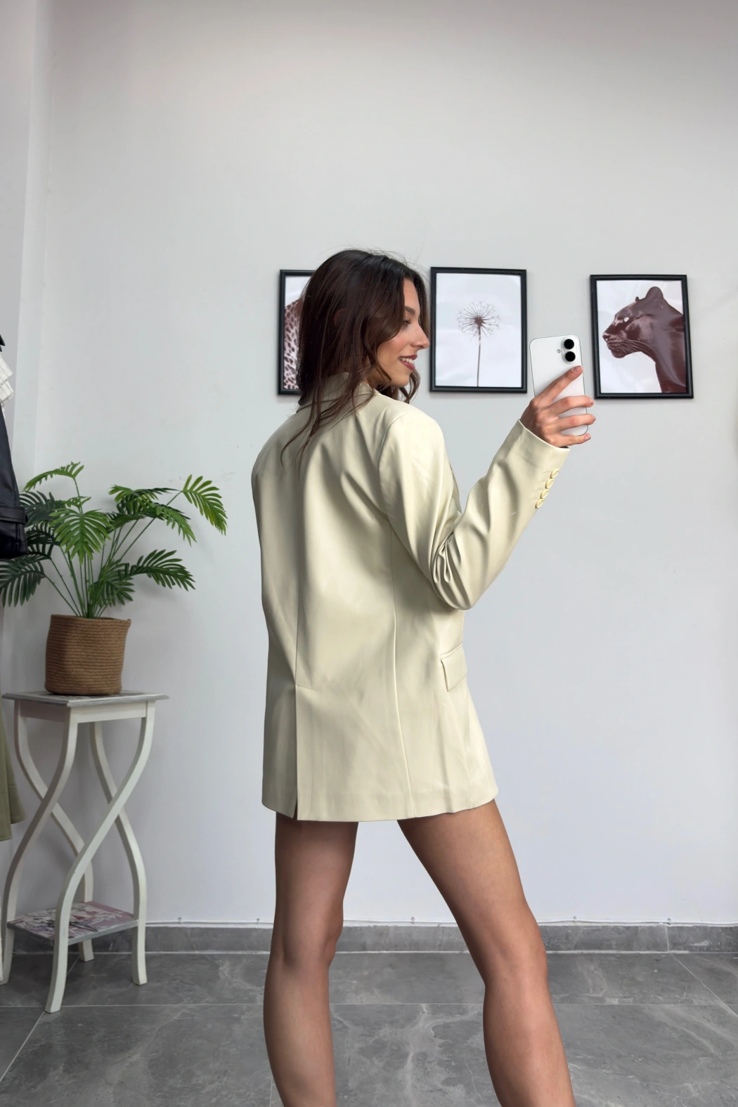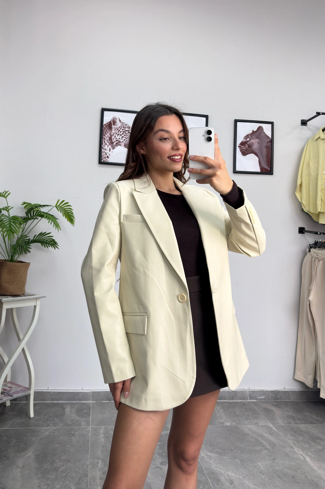 Krem Deri Blazer Ceket