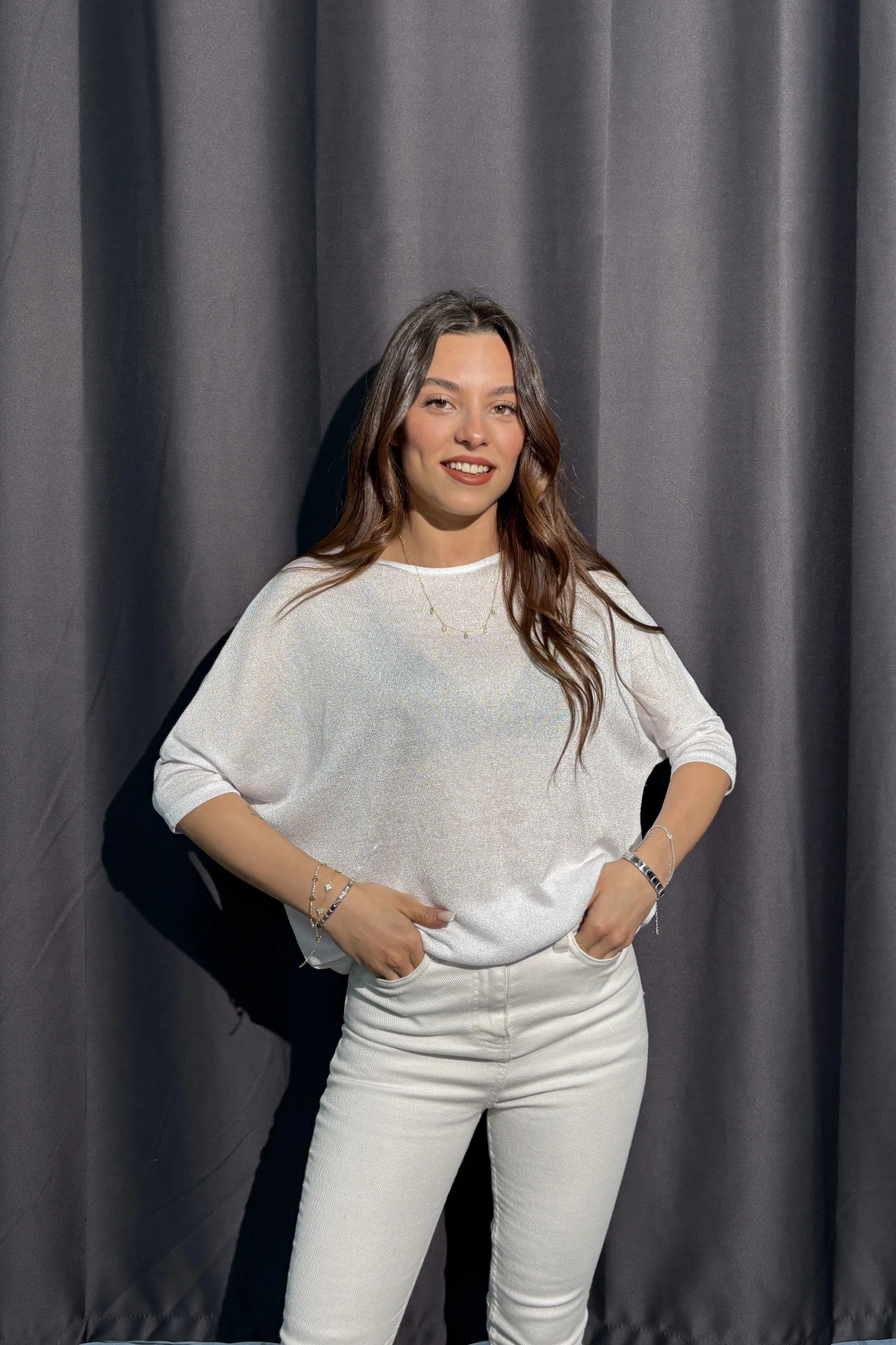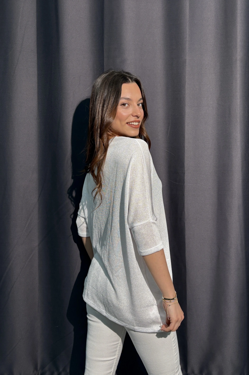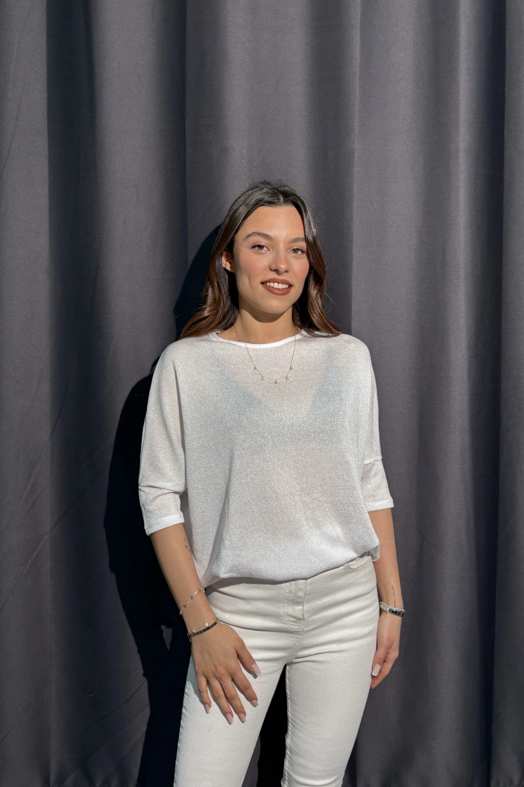 Metalik Dokulu Beyaz Salaş Bluz