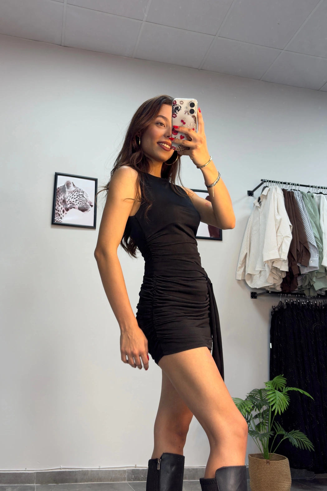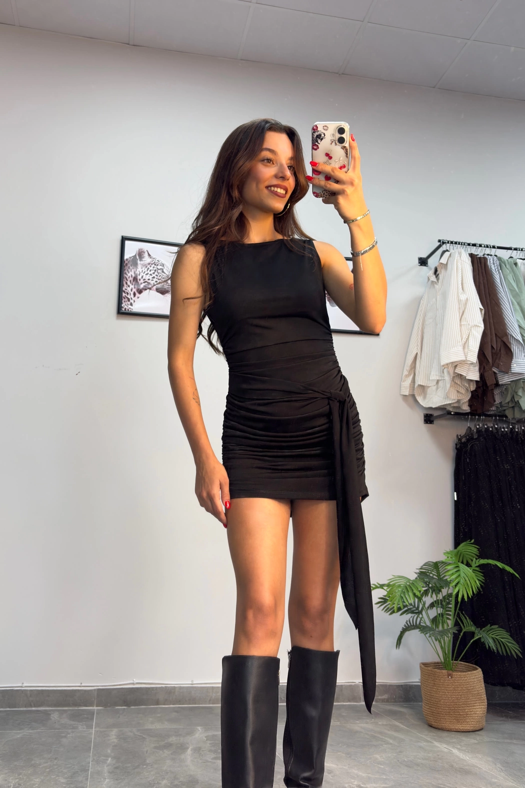 Siyah Büzgülü Kuşaklı Mini Elbise