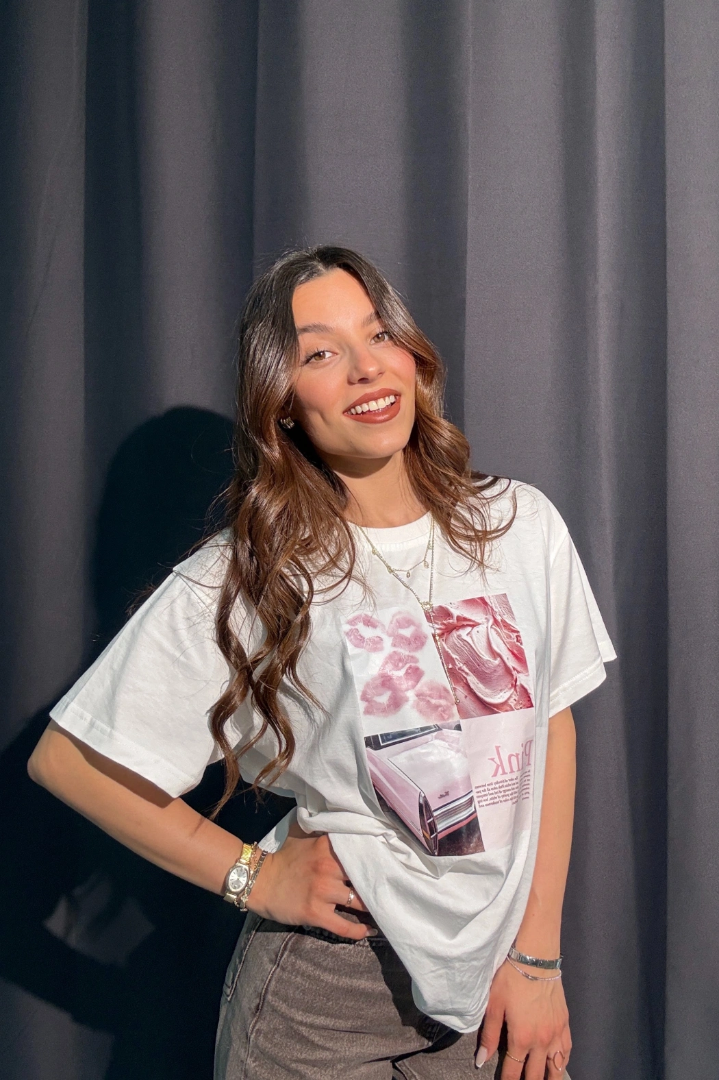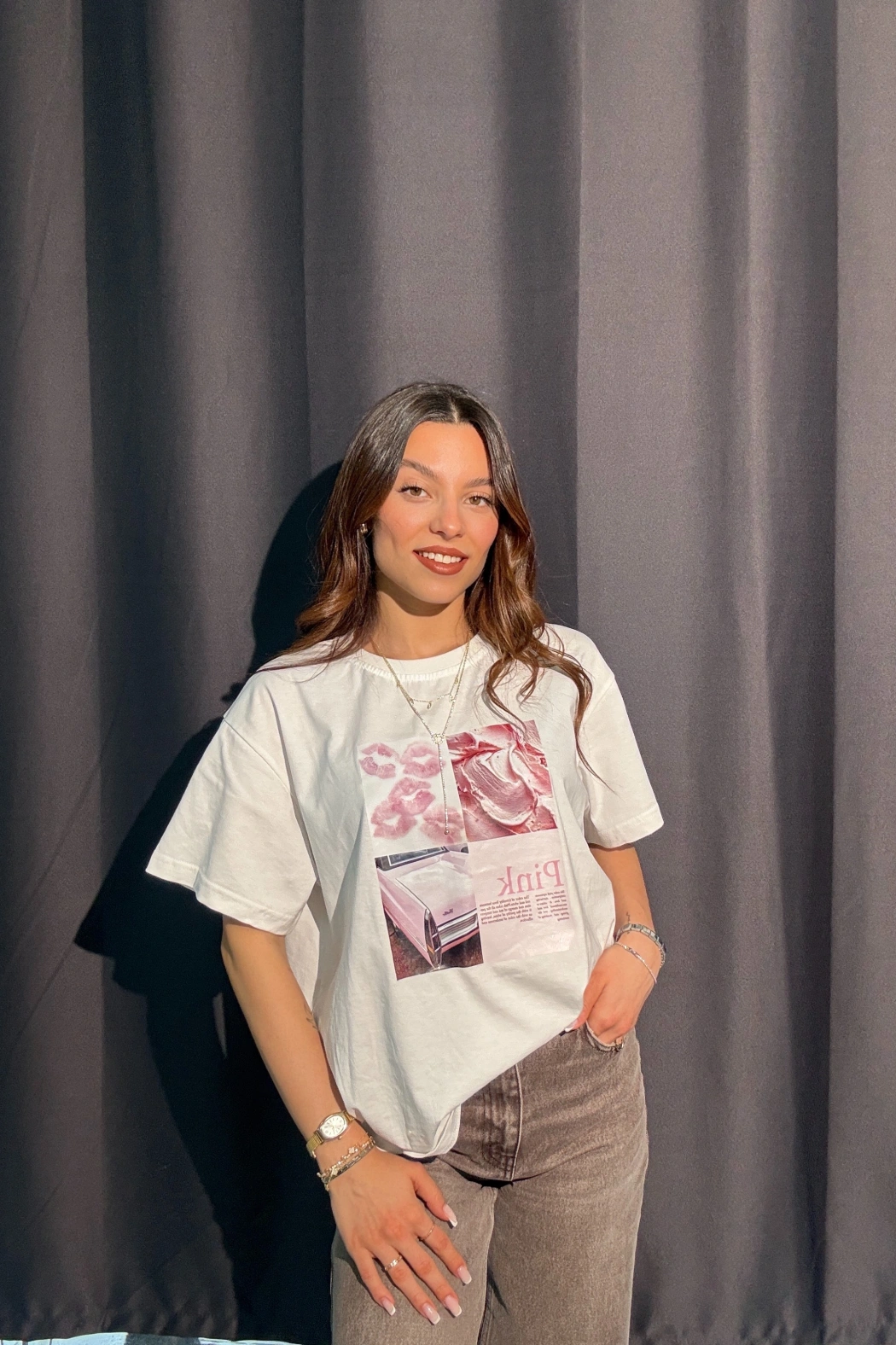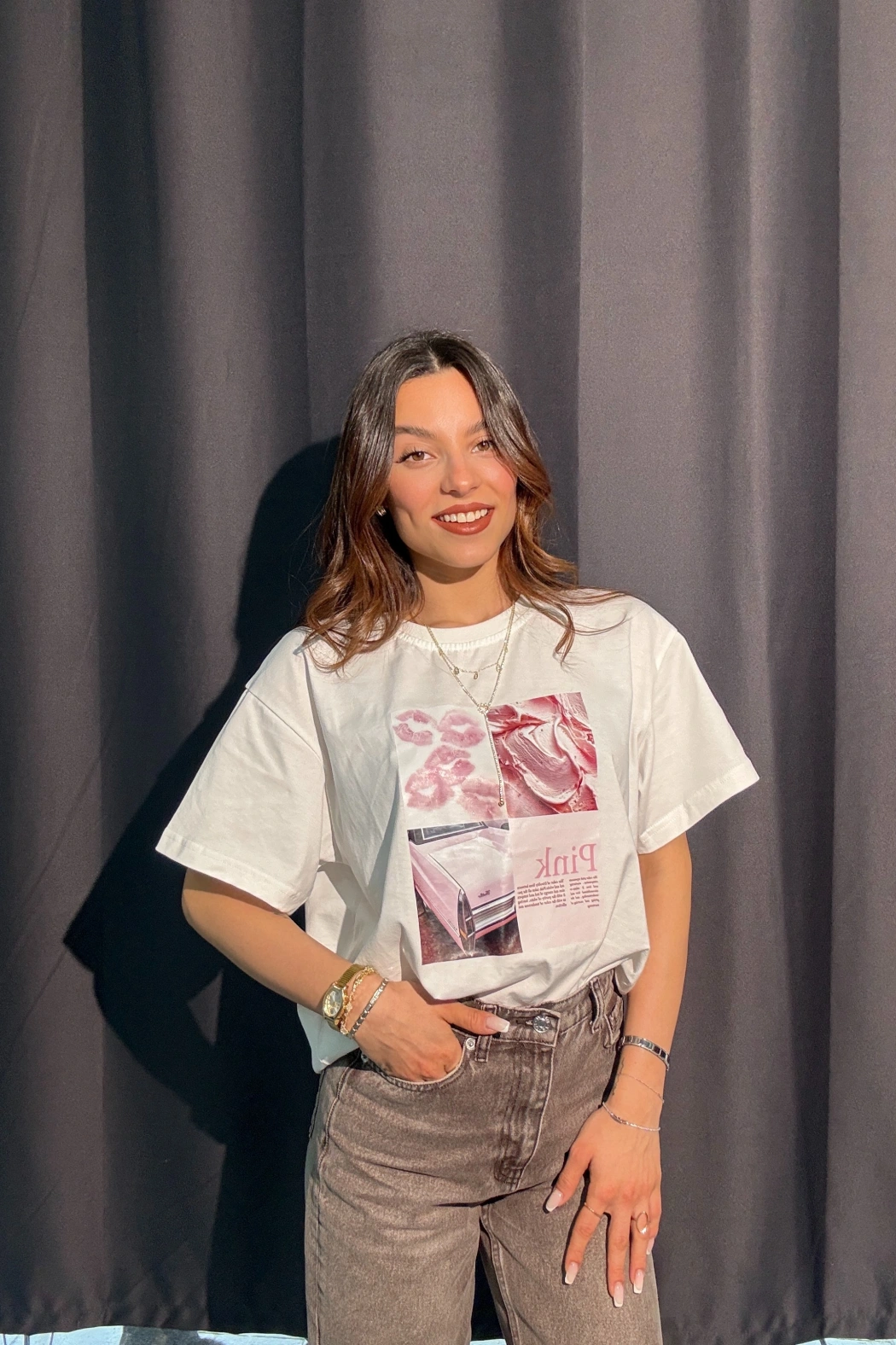 Pink Baskılı Beyaz Tişört