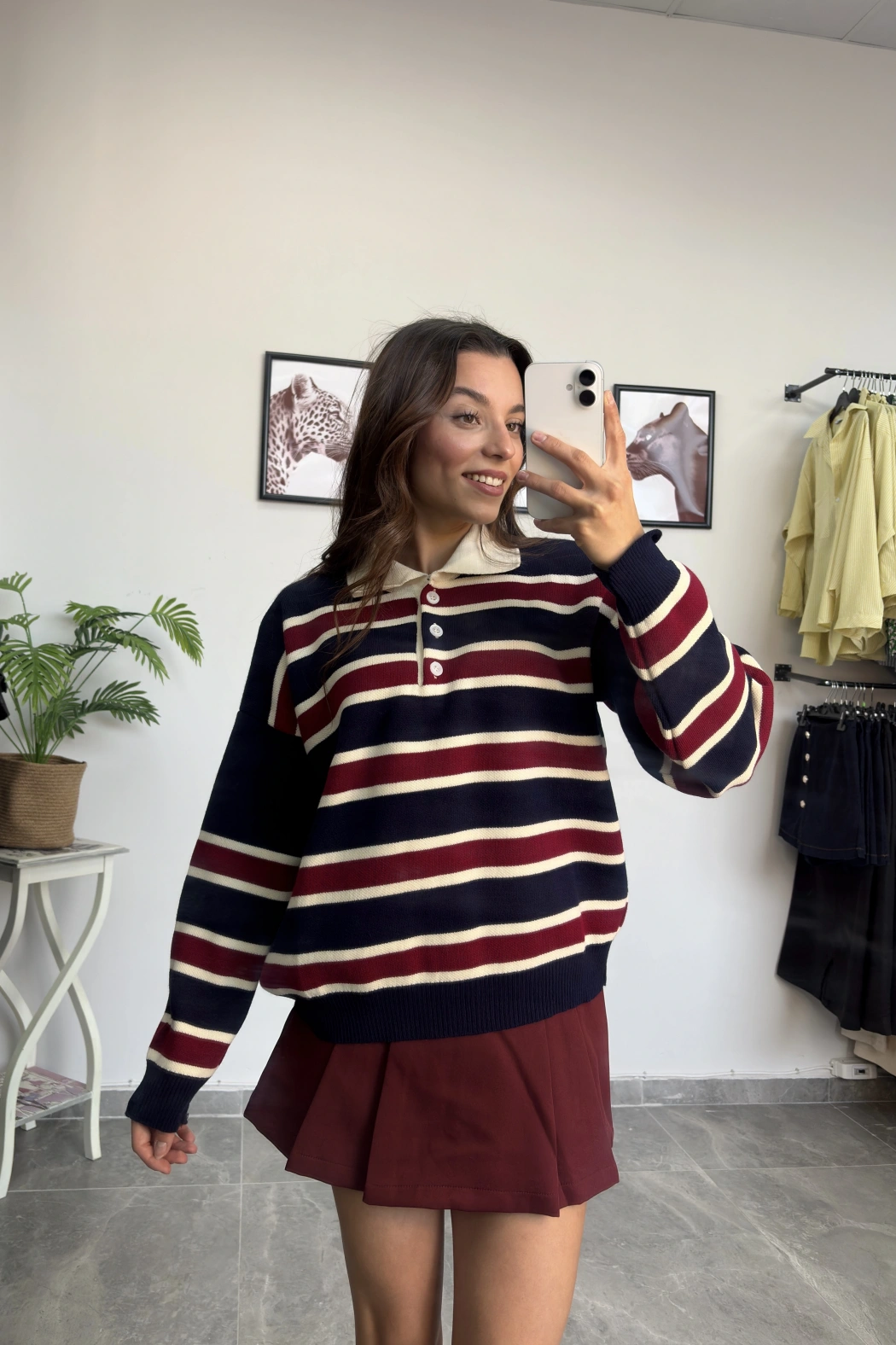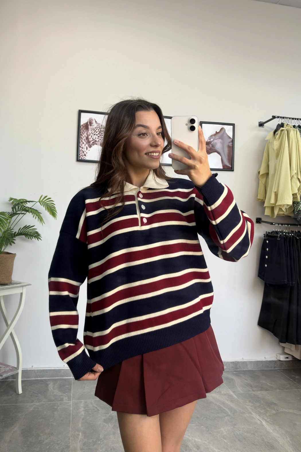 Polo Yaka Bordo Lacivert Çizgili Kazak