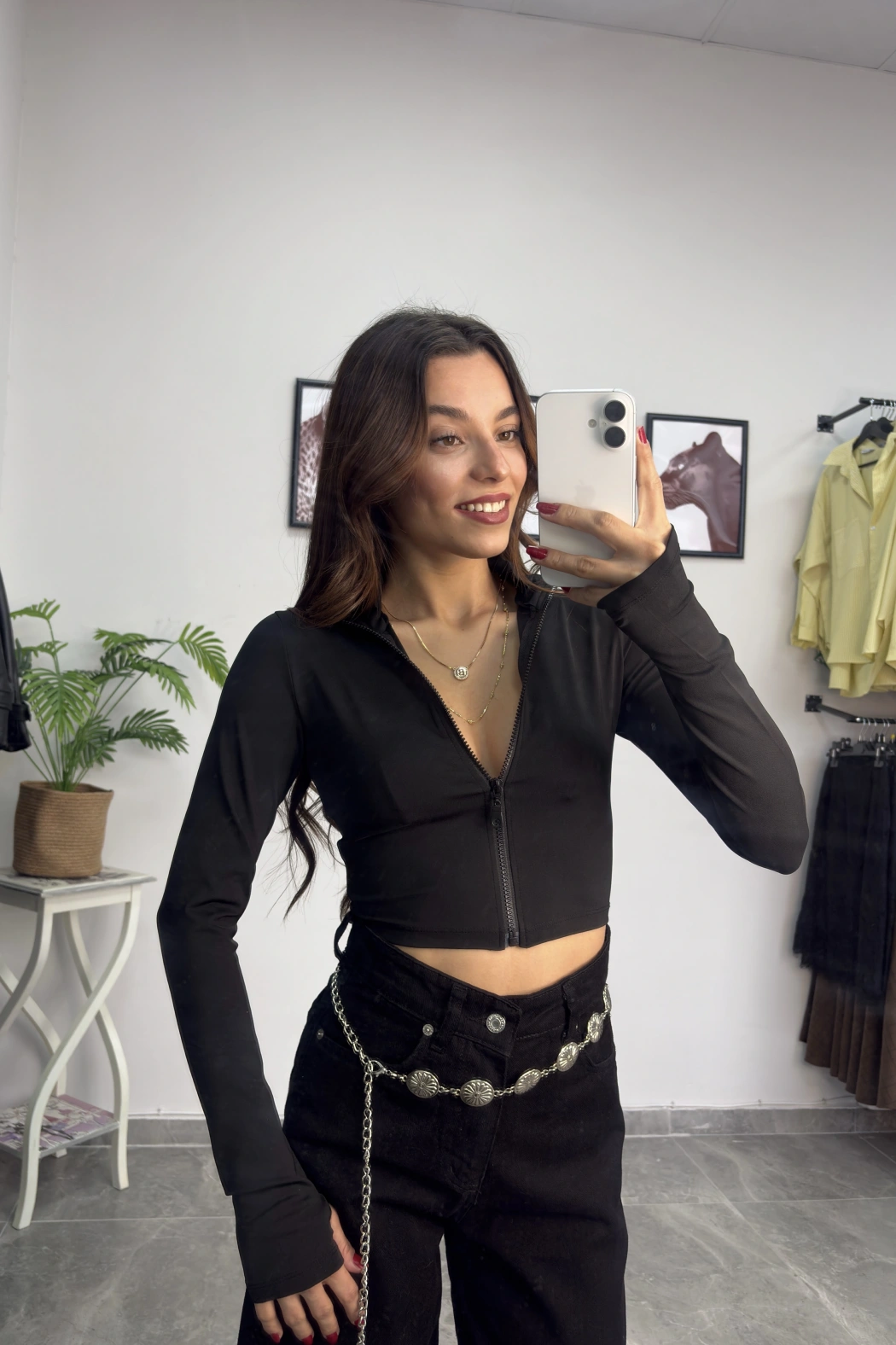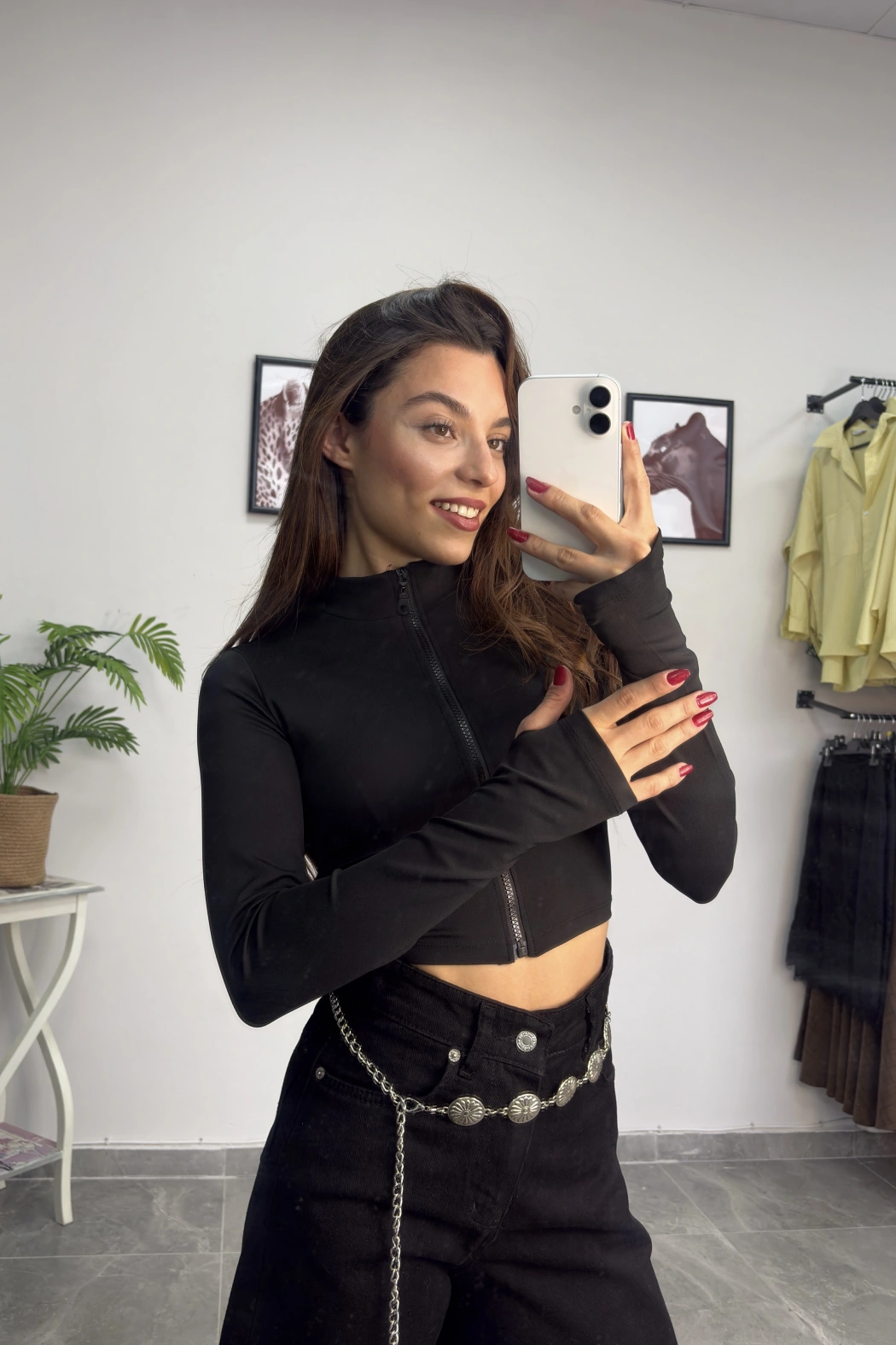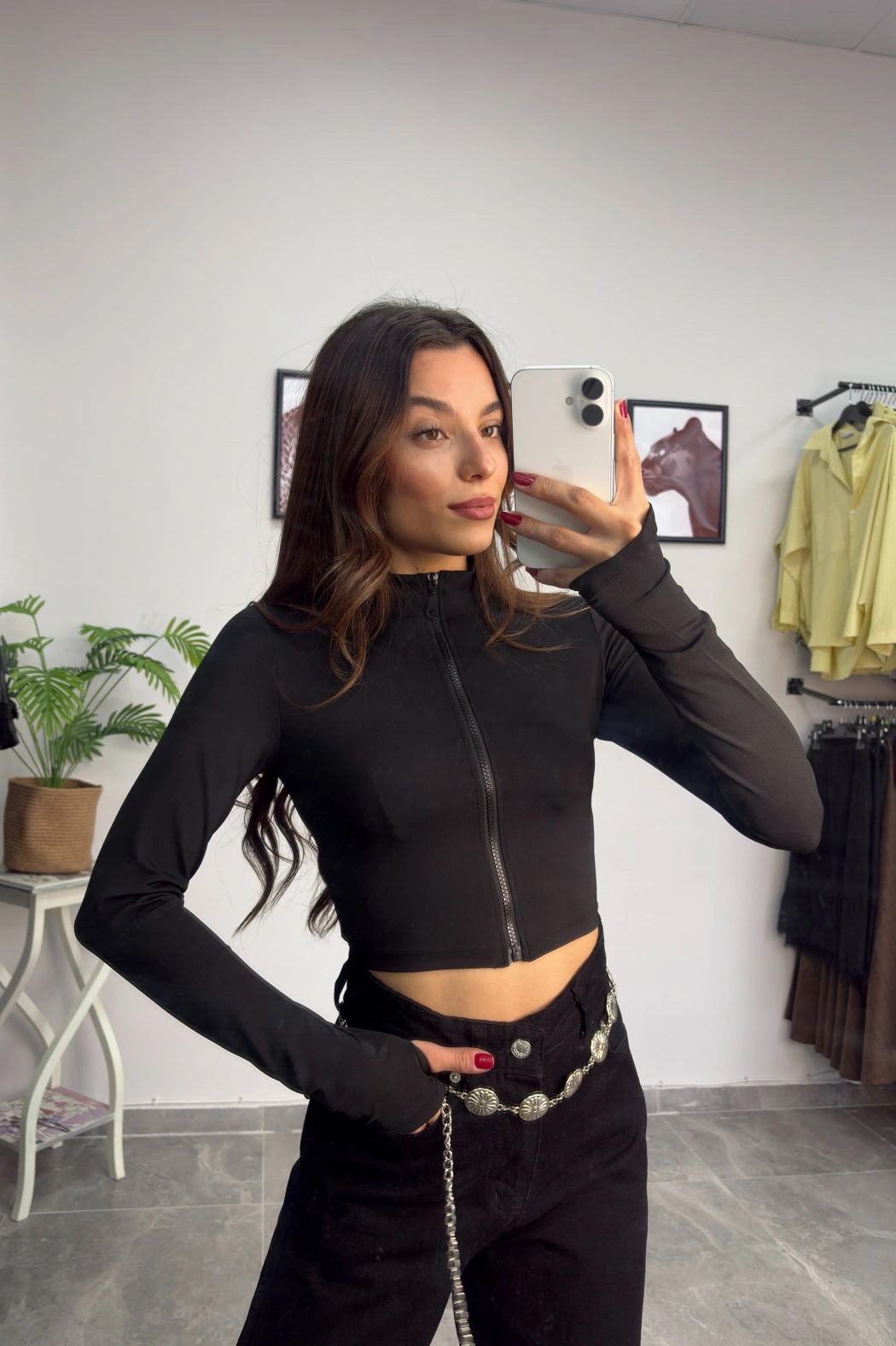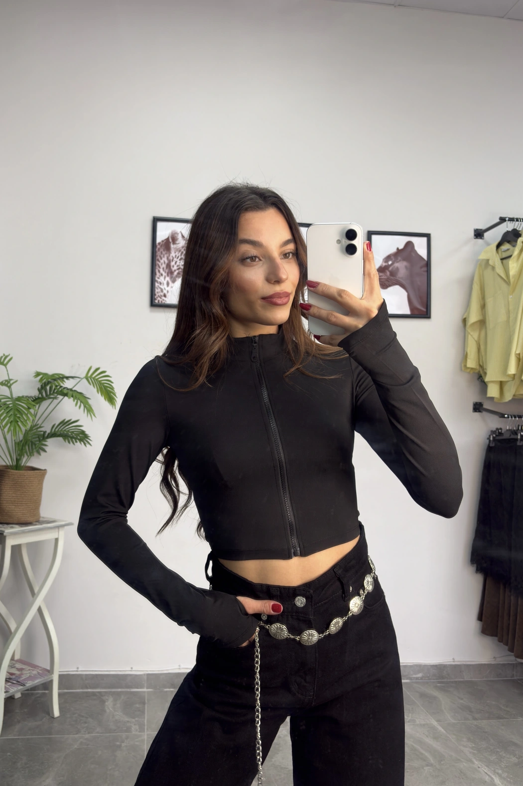 Siyah Parmak Geçmeli Fermuarlı Crop