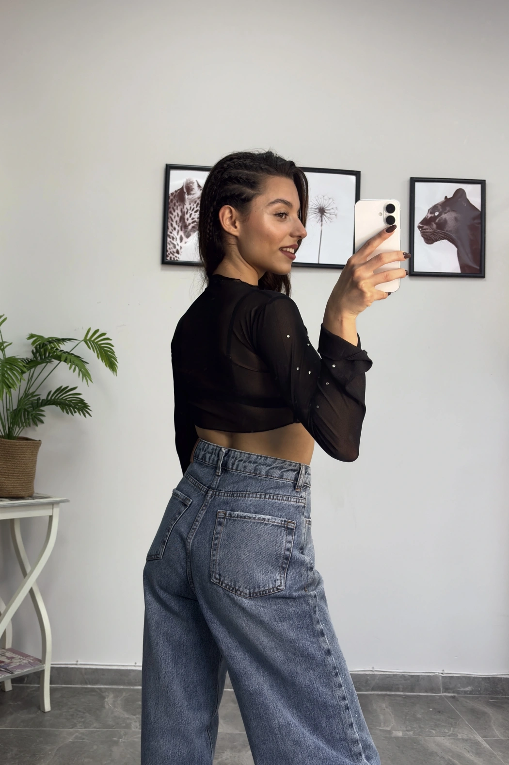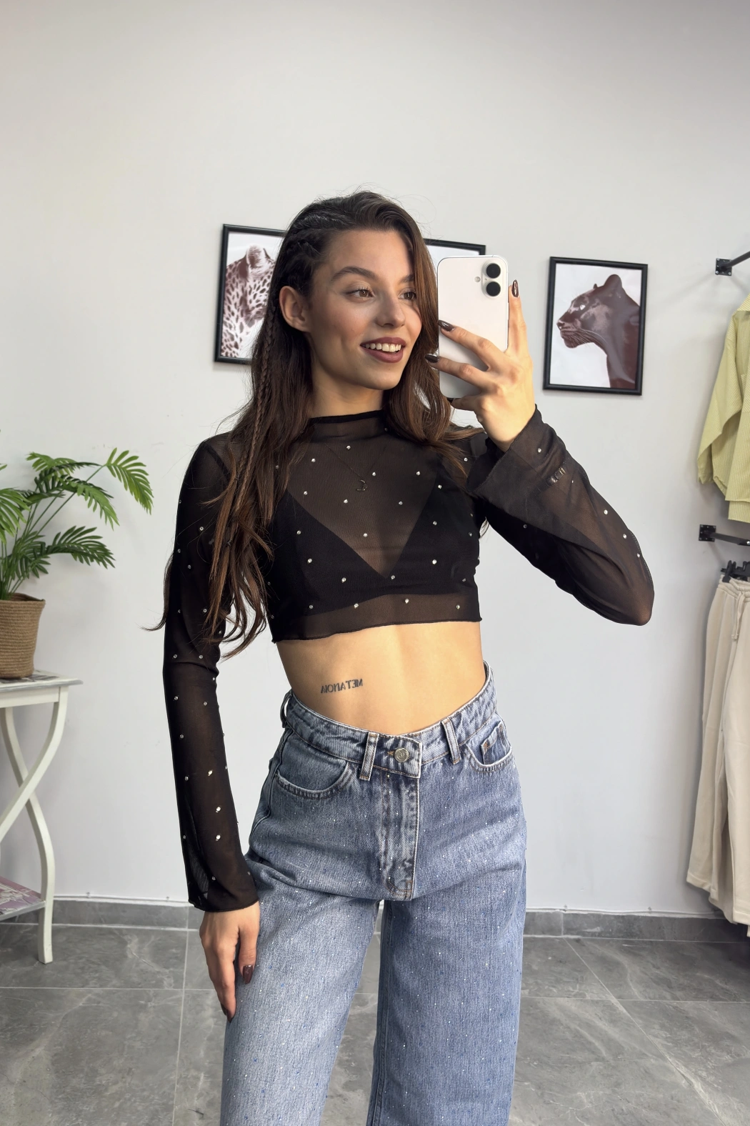 Siyah Parmak Geçmeli Fermuarlı Crop