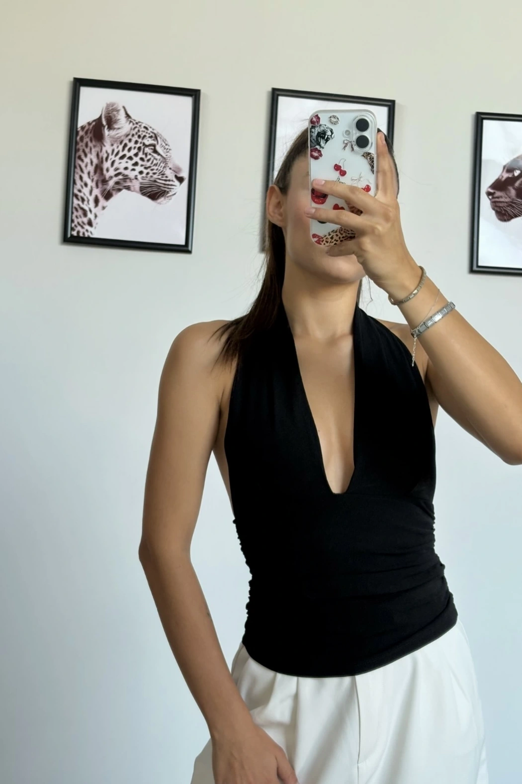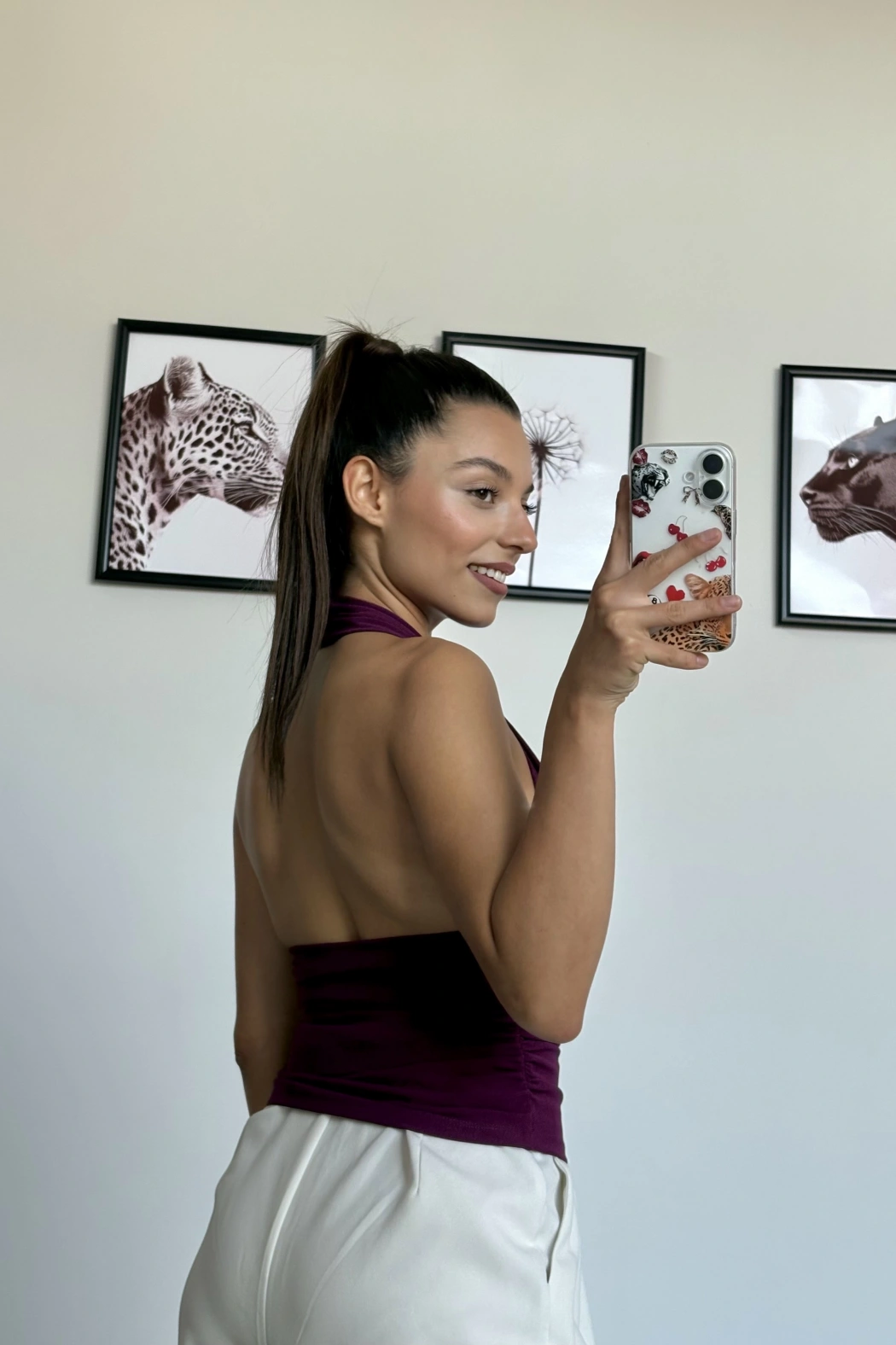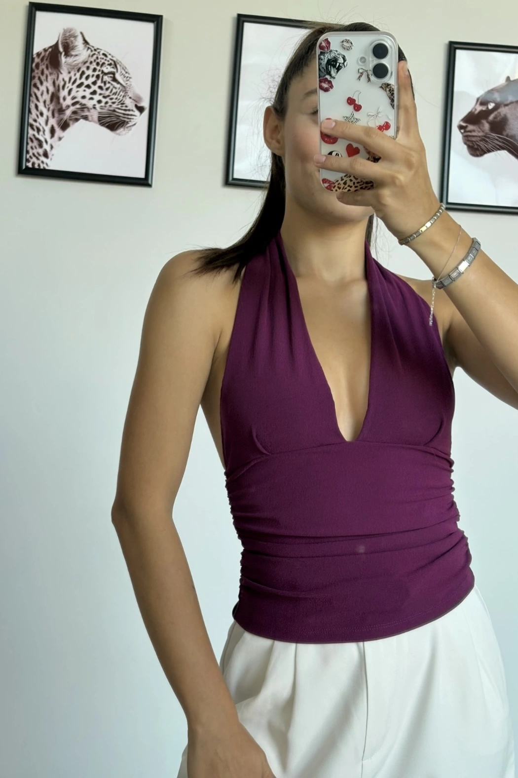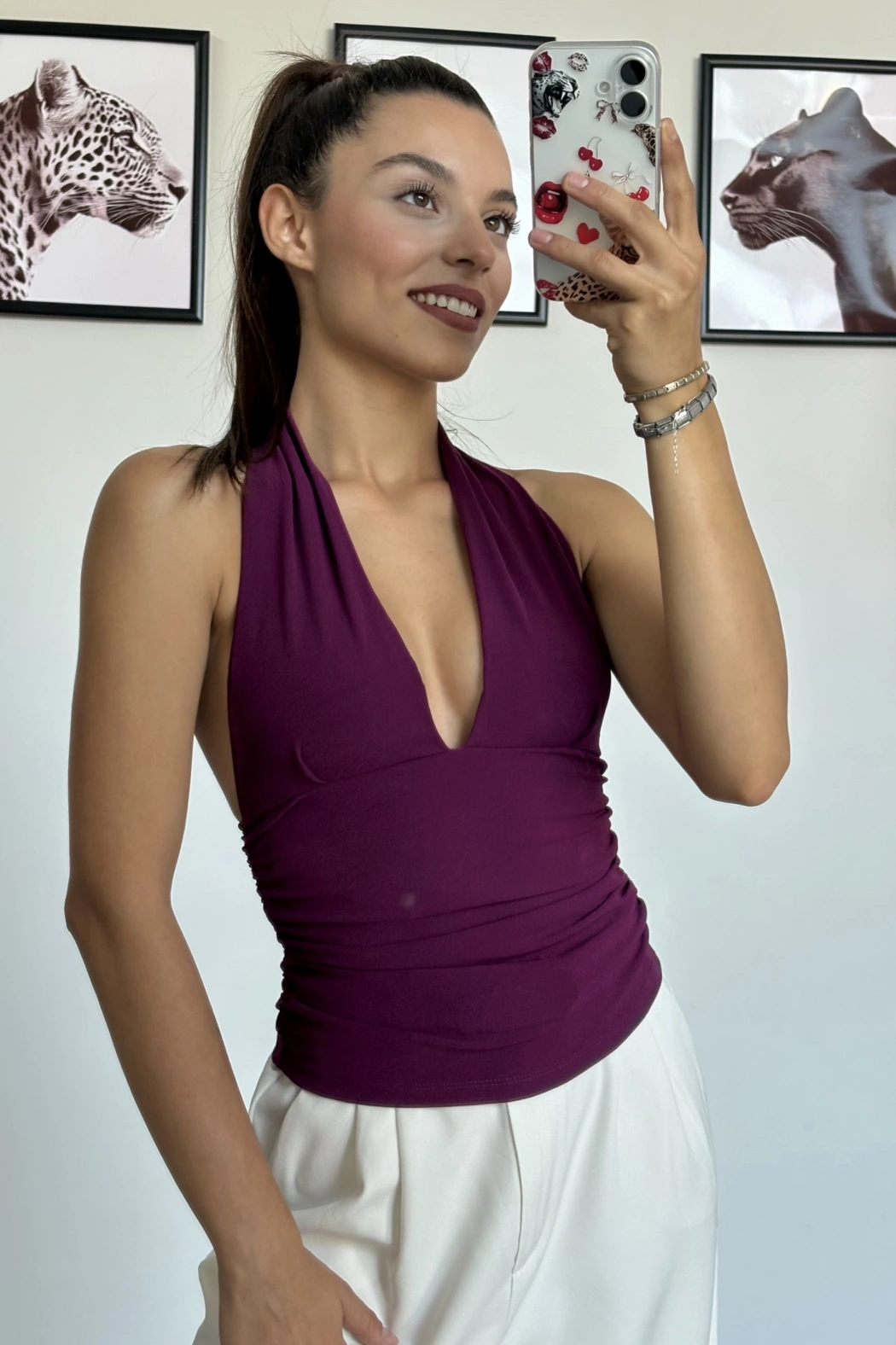 Yanı Büzgülü Mürdüm Dekolte Bluz
